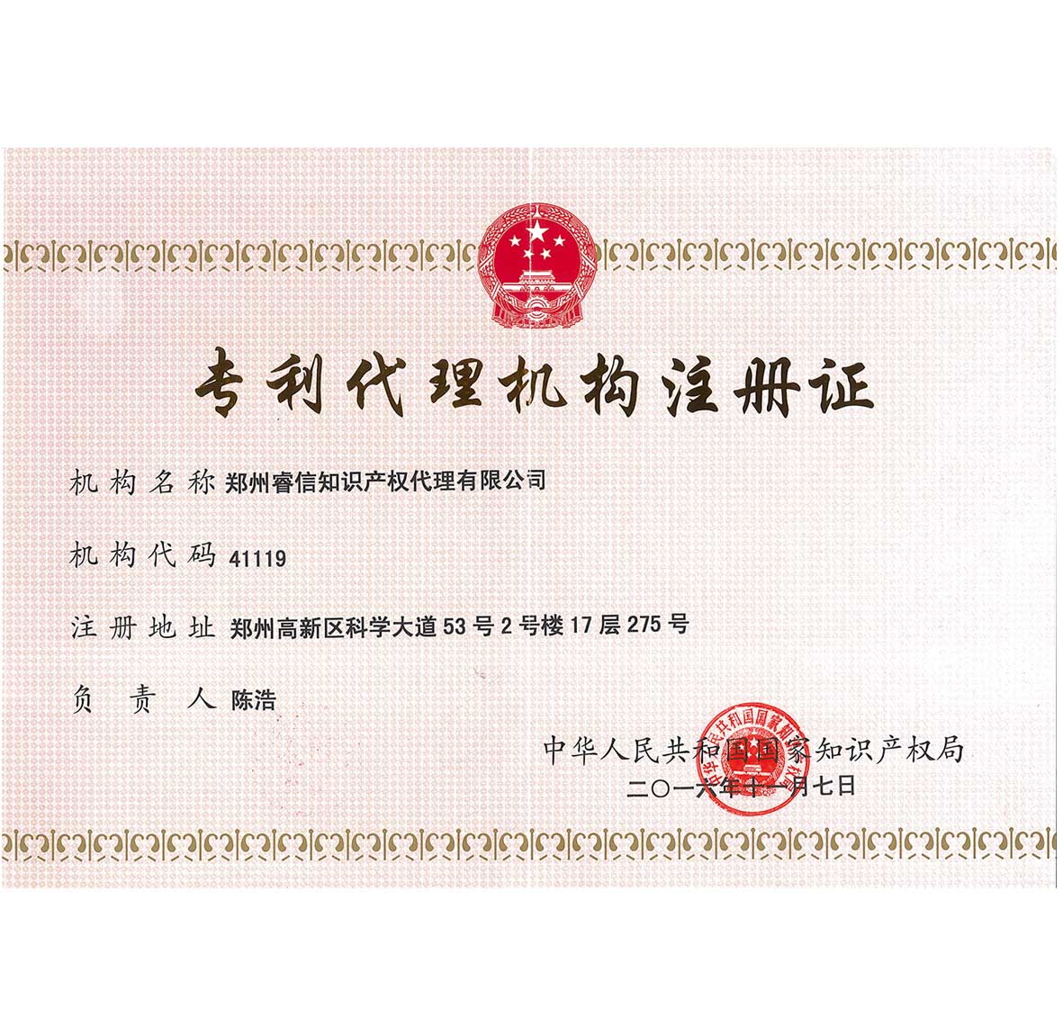公司陳浩總經理被評為“2016年度五星級專利代理人”。